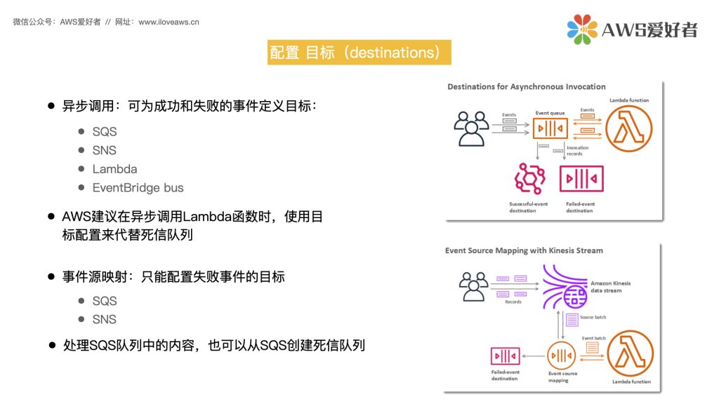 也就是说,Lambda函数从事件队列中获取事件进行异步处理时,如果返回成功,我们可以定义一个成功的目标,如SQS、SNS、Lambda等等;如果处理失败了,我们也可以将这些记录发送到定义的失败的事件目标。